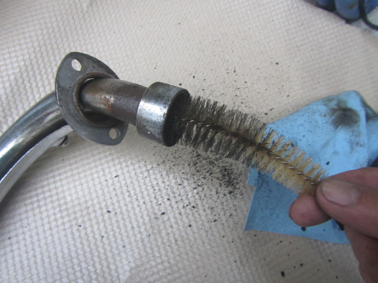エキゾーストパイプのエンジン側にもカーボンが堆積してます
